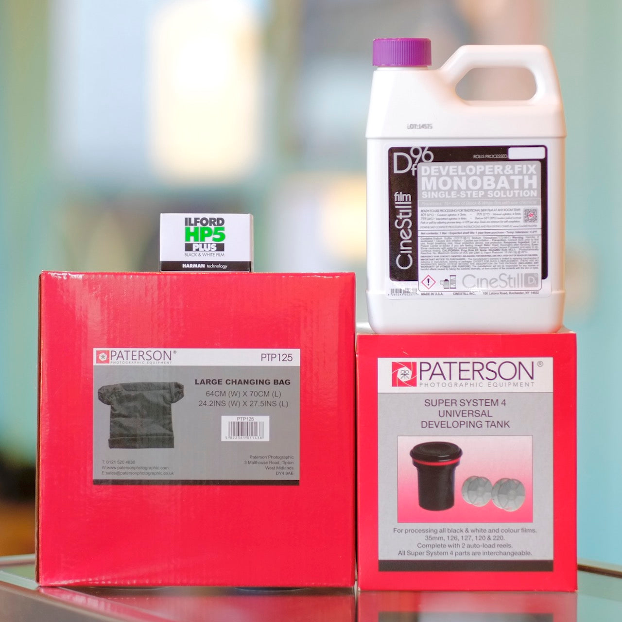 And the equipment in this kit isn't fun-size or scaled back: it's the real deal. The Paterson tank includes two reels and accommodates 35mm, 127, and 120 film; the changing bag is Paterson's full-sized 24x27" model. The Cinestill DF96 is a monobath solution that develops and fixes film in one step.