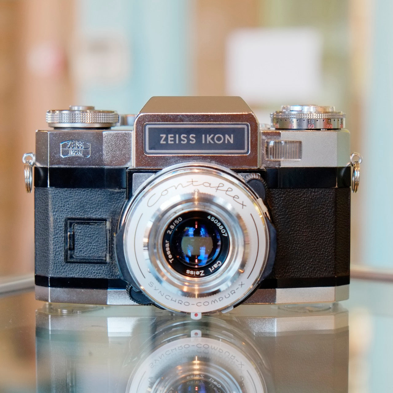 The Contaflex Super BC is a leaf-shutter SLR with a 50mm f2.8 Tessar lens. Shutter working from 1/4s up, metering does not work. Slight edge fungus in the rear element group.