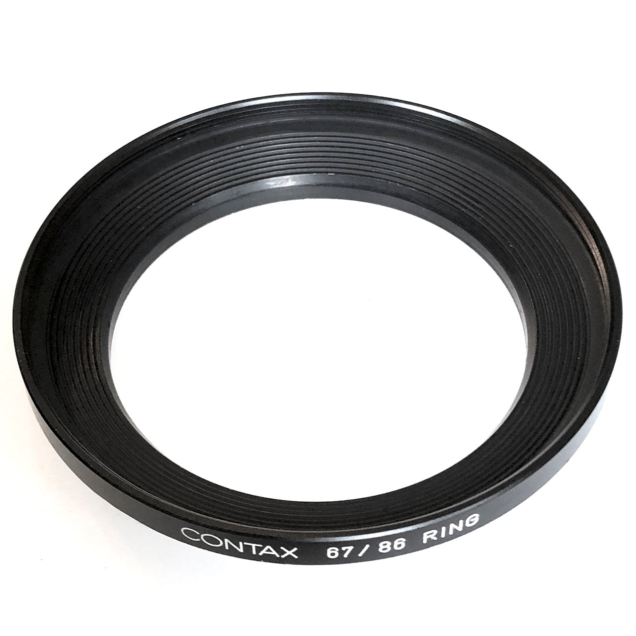 Contax 67/86 adapter allows 86mm hoods to be attached to lenses of 67mm diameter. It also makes a perfectly nice 67mm hood on its own! In good condition, with some paint and finish wear.