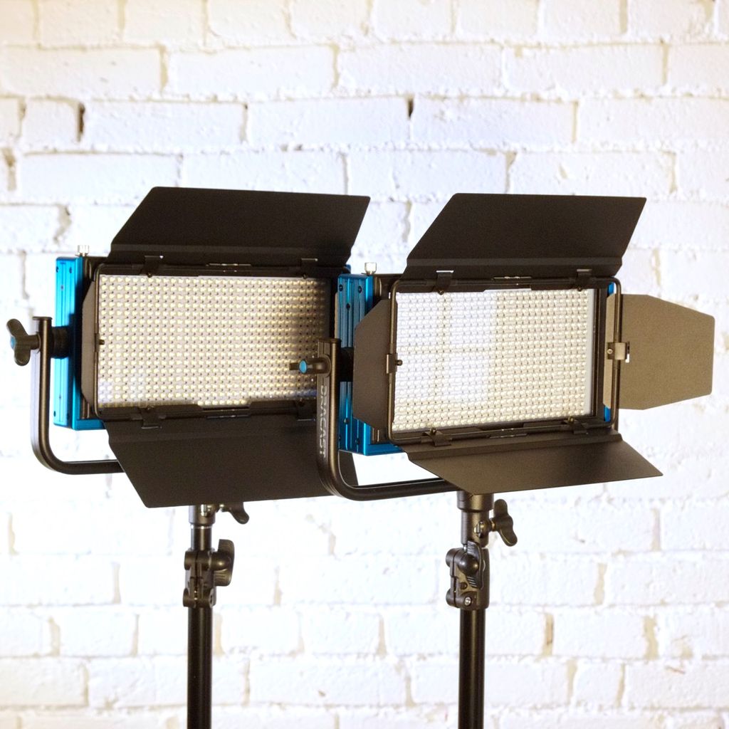 This lighting outfit includes two dimmable 500w-equivalent LED panels with full colour temperature control from 3200-5600k. CRI is 95, which is pretty good! They can run off AC power or V-mount batteries (available separately). Note that due to the nature of bi-color LED systems, actual light output will vary depending on the selected colour temperature. This rental includes: