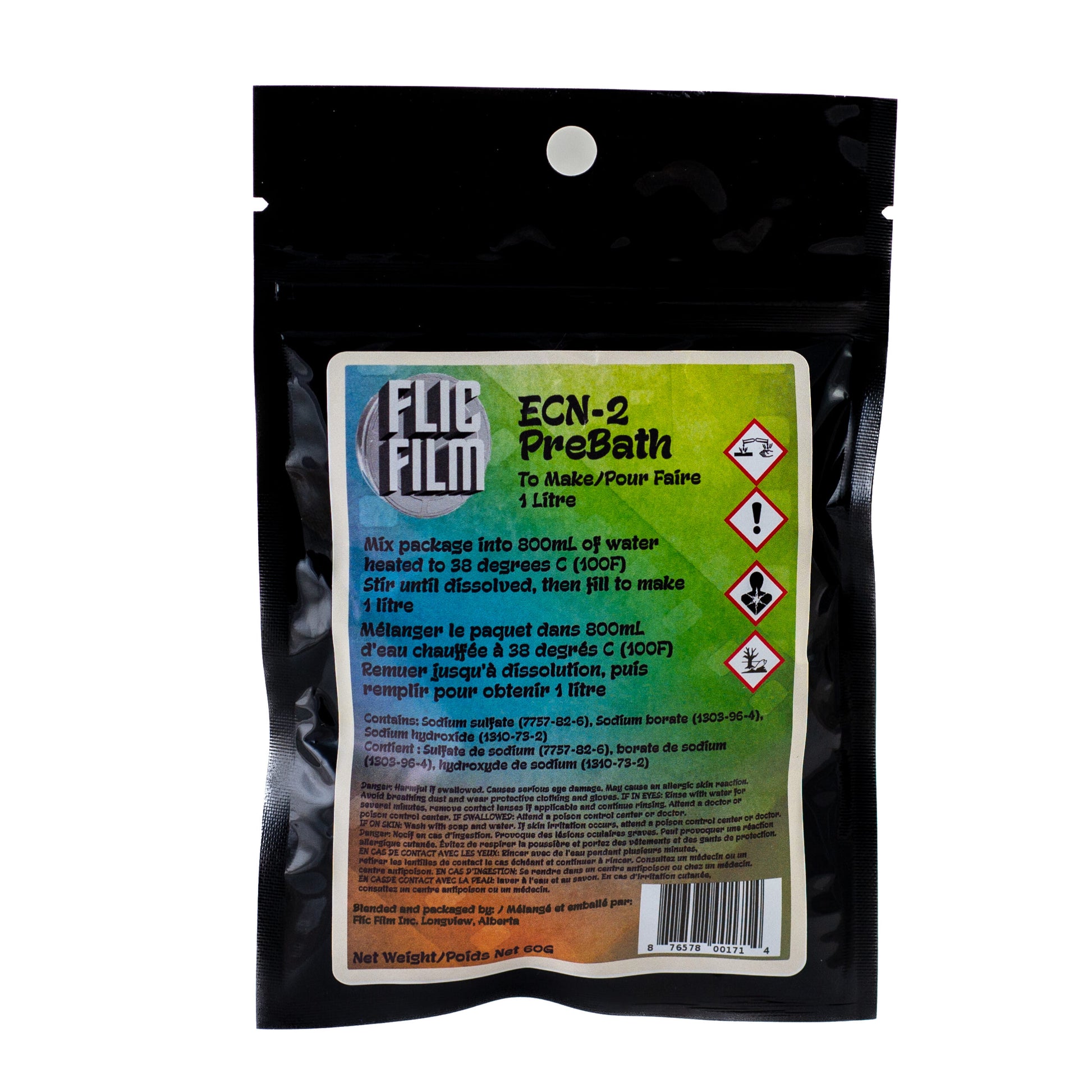 Flic Film's ECN-2 prebath mixes up to 1L of solution, enough to help strip the Remjet backing off up to 16 rolls of film. Film can then be developed in ECN-2 or cross-processed in C-41 chemistry.