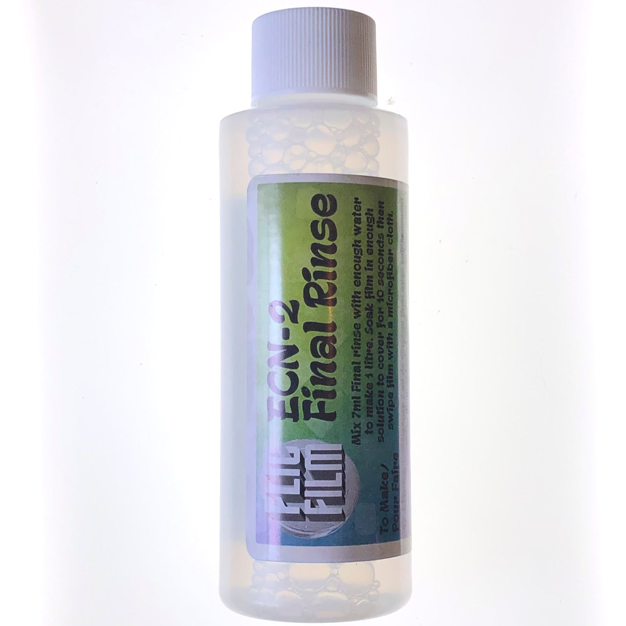 Flic Film's ECN2 Final Rinse is a rinse agent similar to Kodak's Photo-Flo (or Flic FIlm's Slick 200), except with an alkaline formulation that helps clear away Remjet backing. Similar to Photo-Flo, this little bottle will last a long time: it mixes up enough solution to treat up to 256 rolls of film.