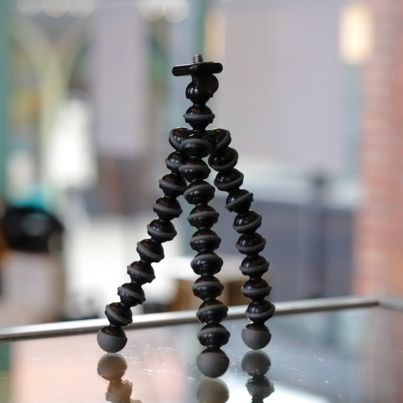 This small (~16cm) tripod is a... an homage to the famous GorillaPod, with bendy legs and a quick-release plate. Suitable for point-and-shoot cameras or small mirrorless cameras.