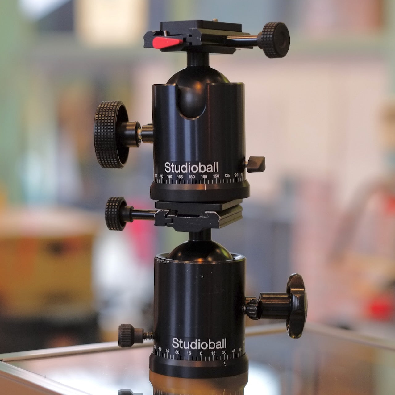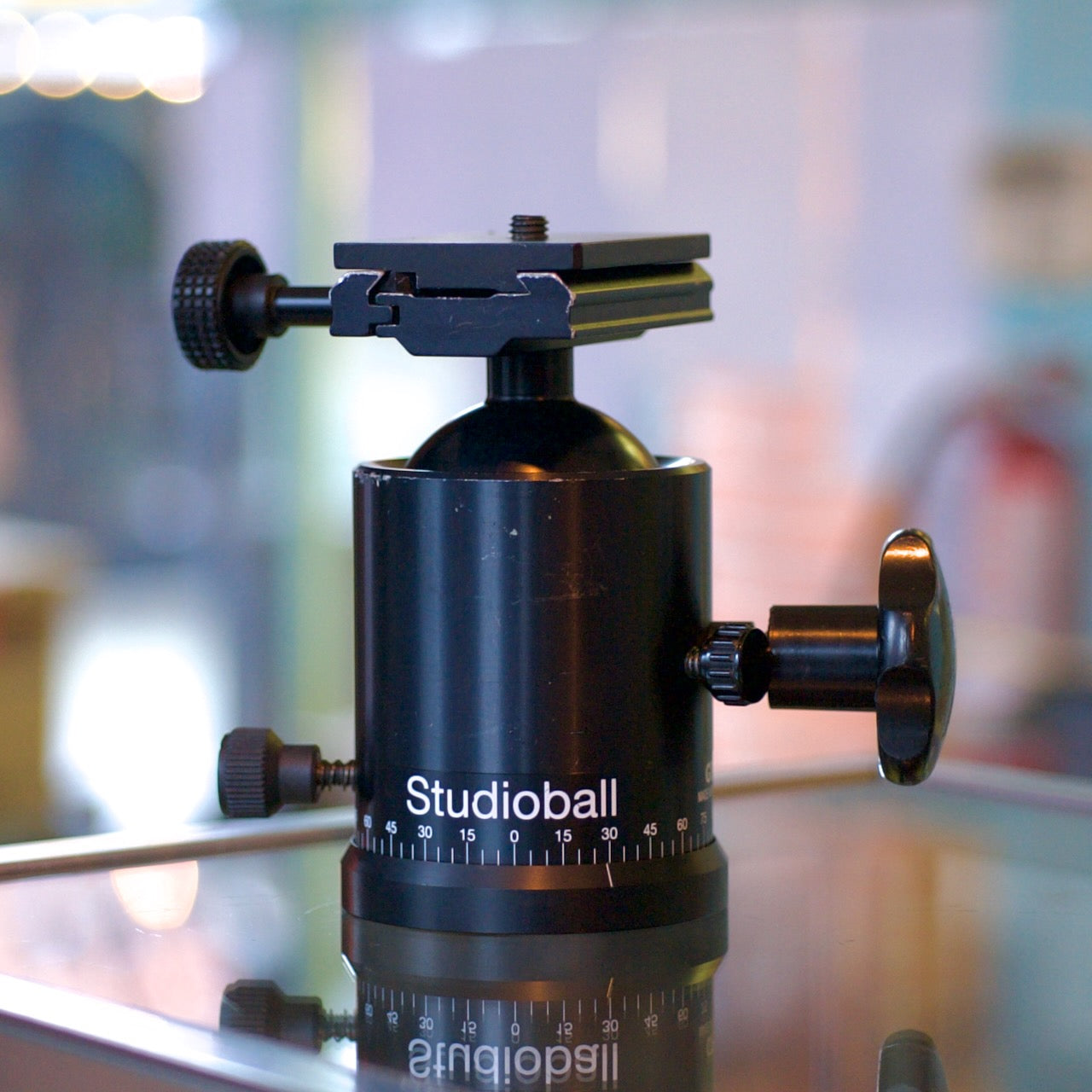 A huge, 1.8kg ball head that's 16cm tall and 9cm across, this Graf Studioball is designed to hold (one assumes) almost any sort of camera you could imagine. Can't find specs for this, but it's sturdy enough to hold up a second Graf Studioball, so that's something. Light cosmetic wear, good function. Includes original plate with a 3/8" thread- not the small-camera standard 1/4", so be aware that you may need to change out the screw or plate if you have a 1/4" thread on your camera.
