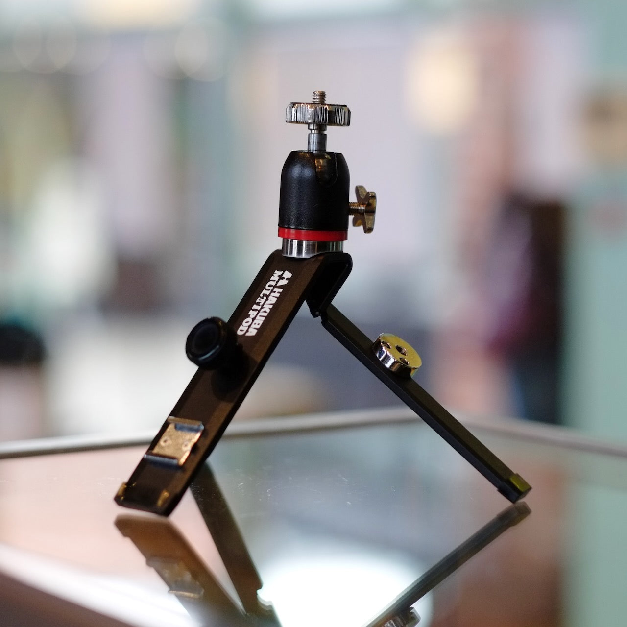 The Hakuba Multipod is a tabletop tripod, but it's also much more! Two things more. The second thing is a flash bracket, and the third thing is a car window clamp. The included ball head is a touch stiff, but it can be unscrewed and replaced with any ball head (as long as it has a 1/4" thread.) Light cosmetic wear.