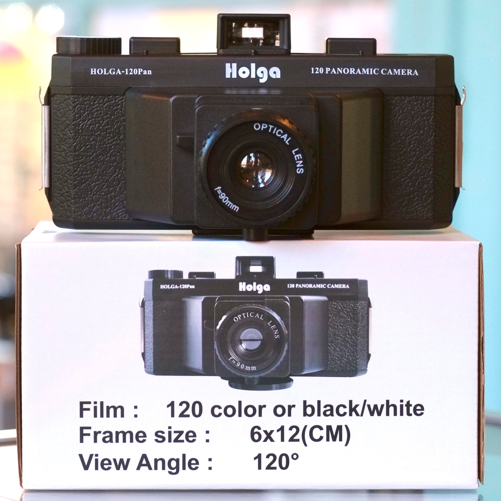 The Holga 120 Pan is a medium format panoramic camera that shoots 6x12cm images on standard 120 rollfilm. It's a Holga, of course, so it's all plastic (including the 90mm f8 lens)- but it's honestly not a badly designed camera. There's a tripod socket on the base and a real optical viewfinder up top, both centred with the lens, and a pair of hot shoes to ensure even flash coverage.