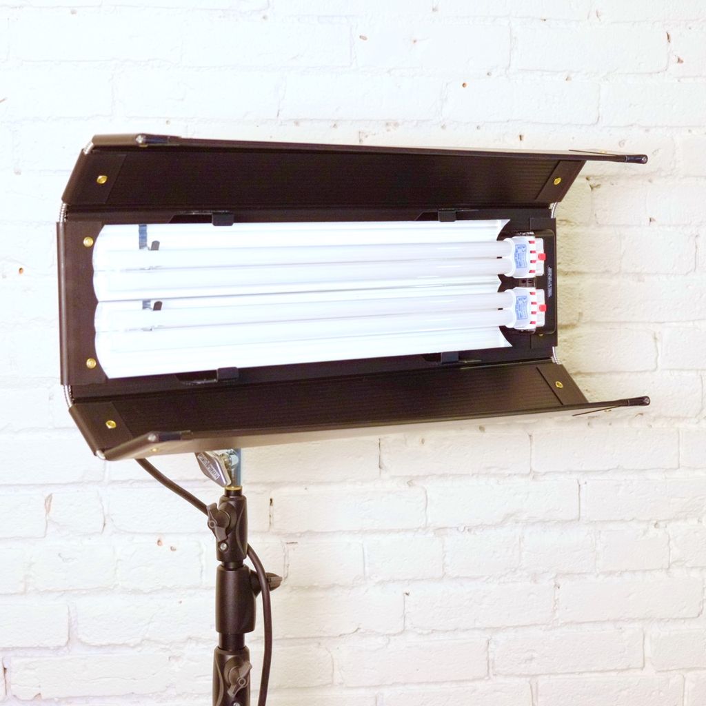 A single Kinoflo DivaLite 201 two-lamp fluorescent light bank, designed to provide soft, even lighting for stills or video. 3200k and 5500k tubes are included to match the colour temperature of any additional lights being used (our Arri fresnels are 3200k). Fully dimmable, with a Flozier for additional softening. This rental includes: