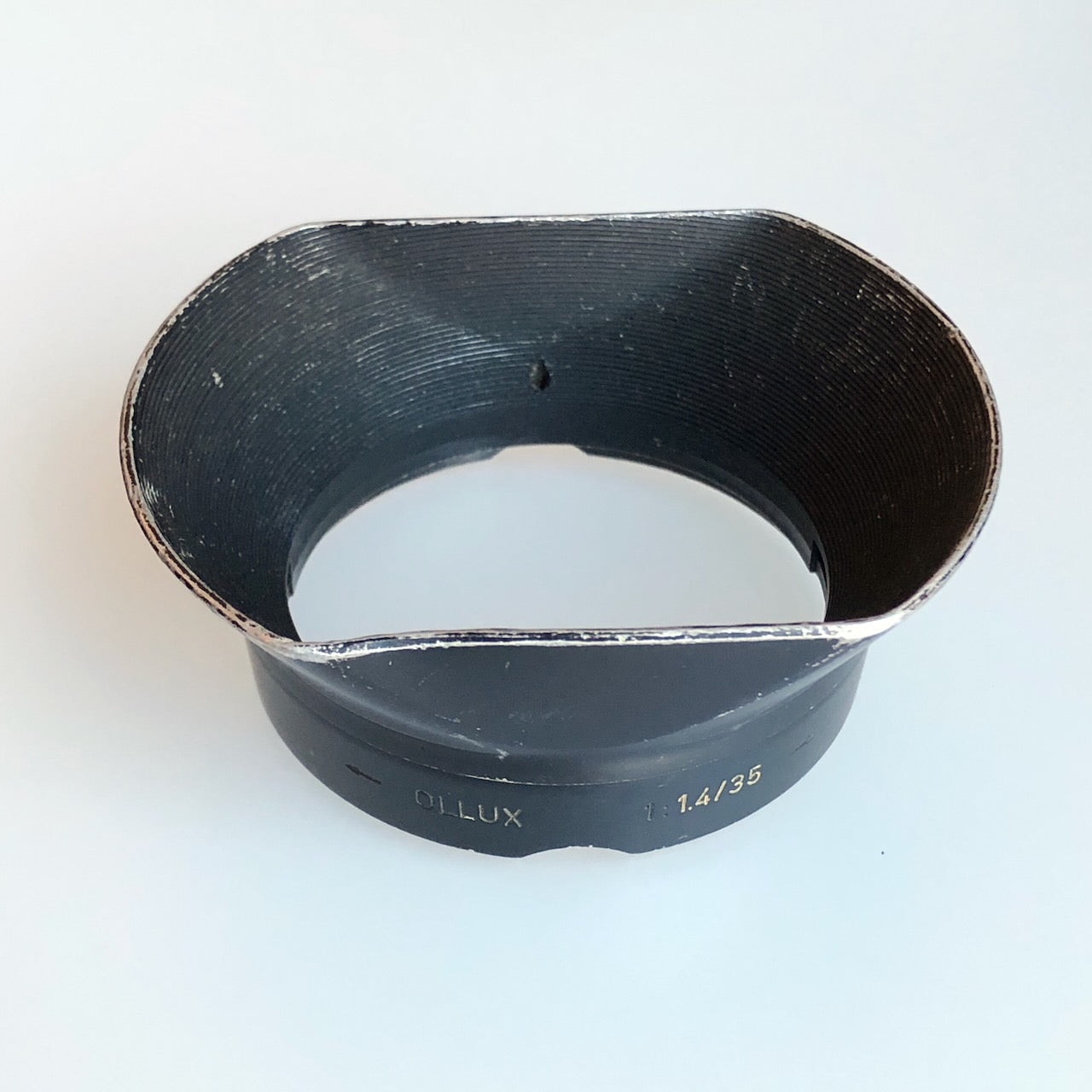 This rare Leitz Canada Ollux hood is in okay cosmetic condition, with notable paint and finish wear and a dent in the hood rim (visible in the image.) Works fine, of course. Fits the Summilux-M 35mm f1.4 v.1 lens.