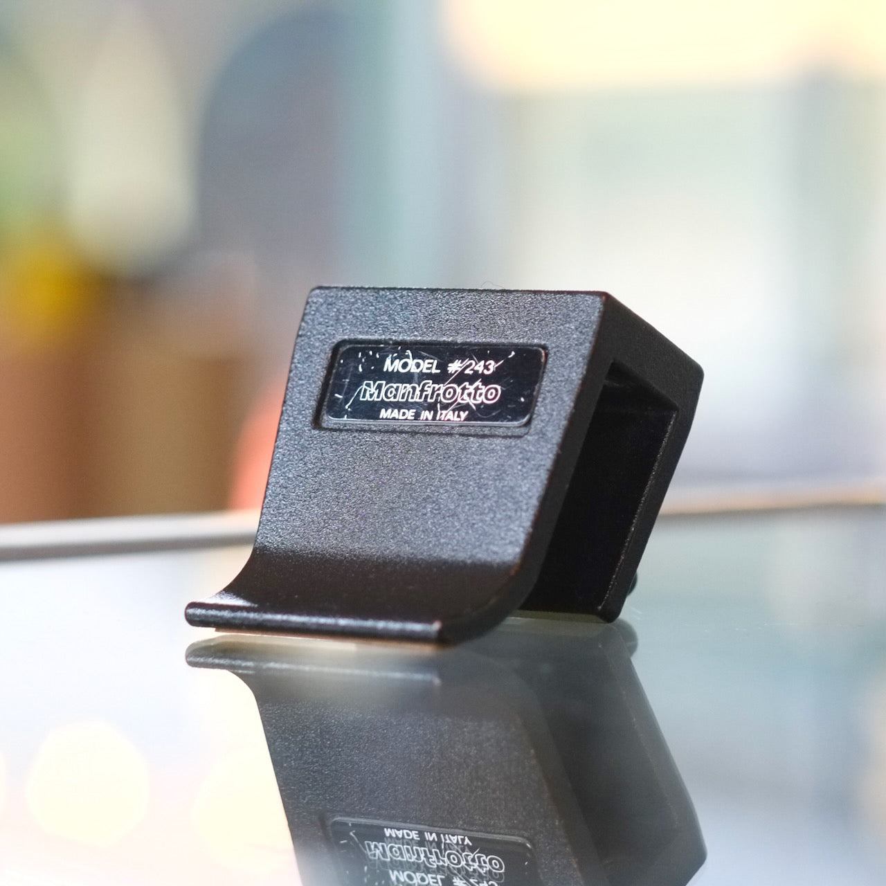 The Manfrotto #243 is a panel clamp camera mount with a cork-padded jaw that can slip over panels up to 1cm thick. Its most obvious use is probably as a car window mount, but don't let that limit your imagination. Light cosmetic wear, good function. 3/8" thread up top for head mounting (head is not included.)