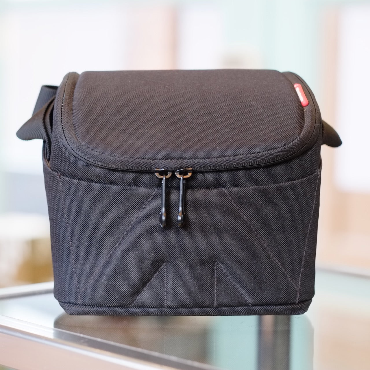 The Manfrotto Amica 20 is a compact camera bag with room for a compact SLR or mirrorless camera and a few accessories, maybe- depends on the camera and the accessories. Interior dimensions are approximately 9x16x17cm.