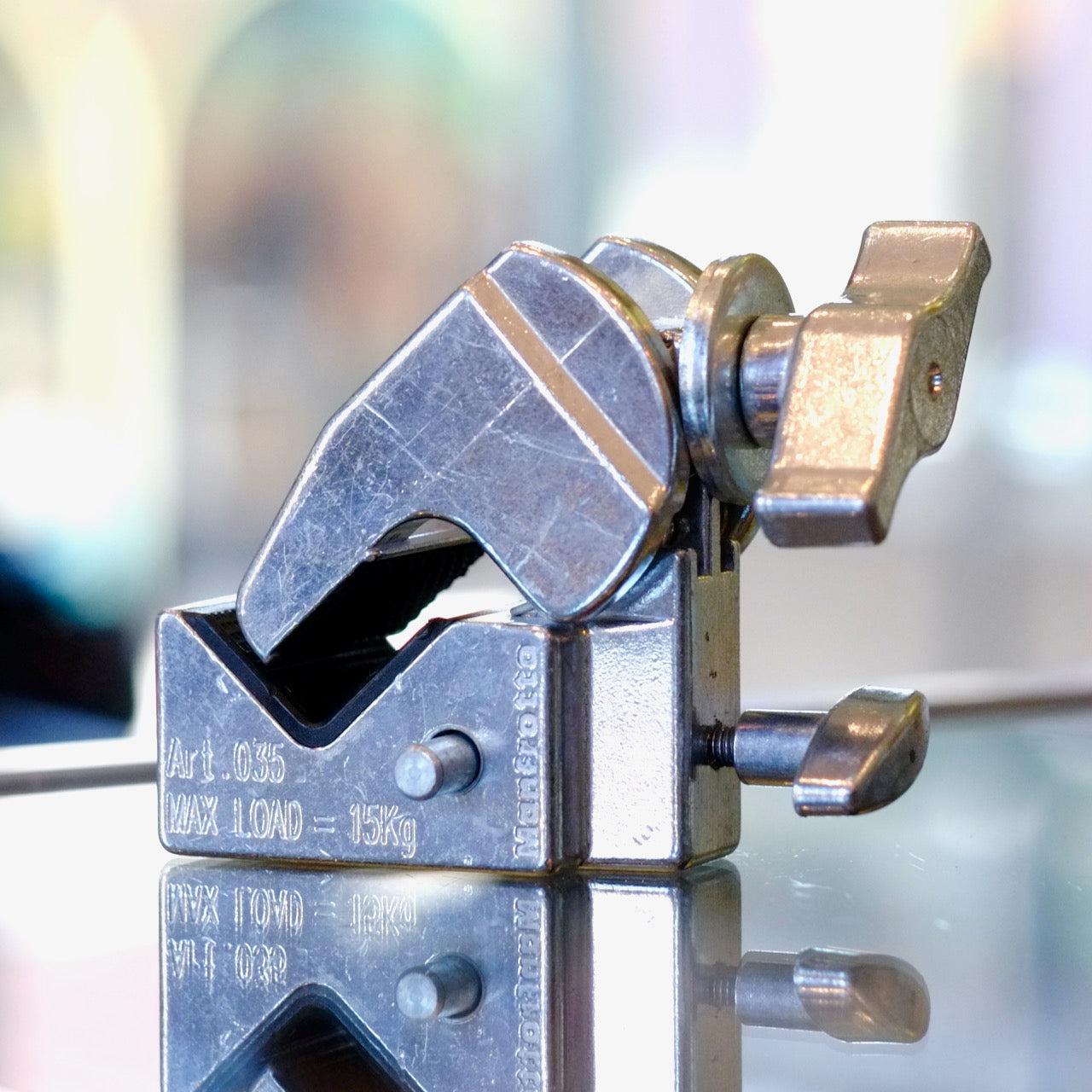 The Manfrotto Superclamp is a studio staple for a reason: it's sturdy, reliable, easy to use, and multi-purpose. It'll grab boards, pipes, flashes and more, and features a 1/4" threaded socket and a light stand stud receiver with a security lock. It's a good clamp! Good working order, minor cosmetic wear.