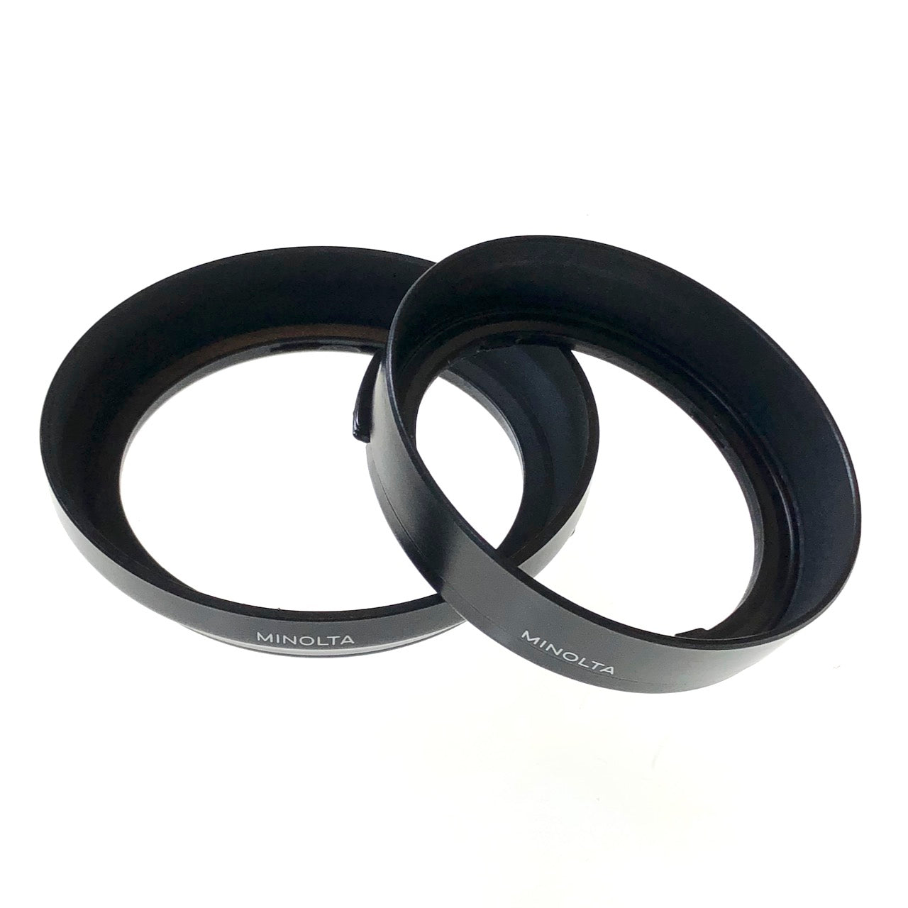These are clip-on lens hoods for Minolta lenses. They are designed to fit only a specific lens or several, and will not mount on other lenses. Please inquire with us if you have any questions regarding compatibility. All hoods are free from damage such as cracks or chipped mounts. They may have some minor cosmetic scuffing or wear.