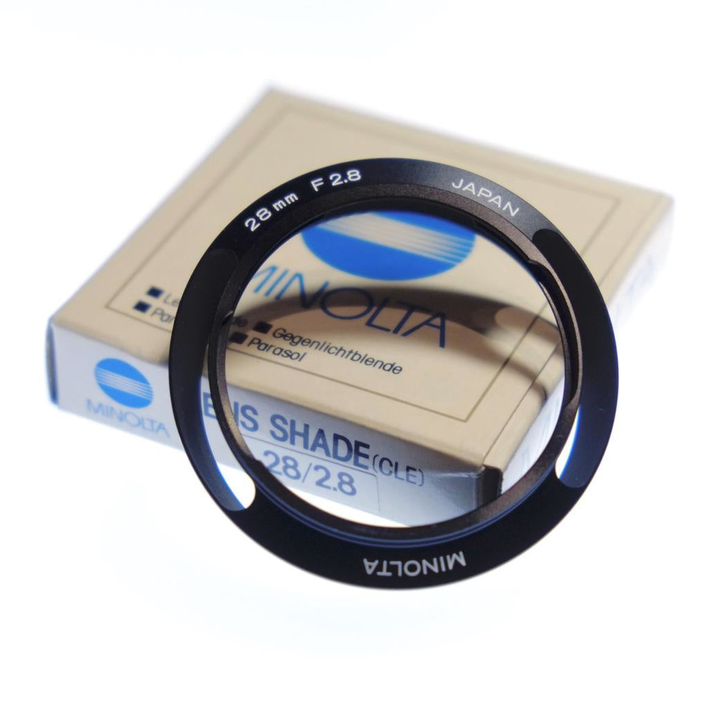 Minolta lens shade for the CLE 28mm f2.8 lens in excellent condition. Attaches via bayonet lugs- this won't screw into any other lens.