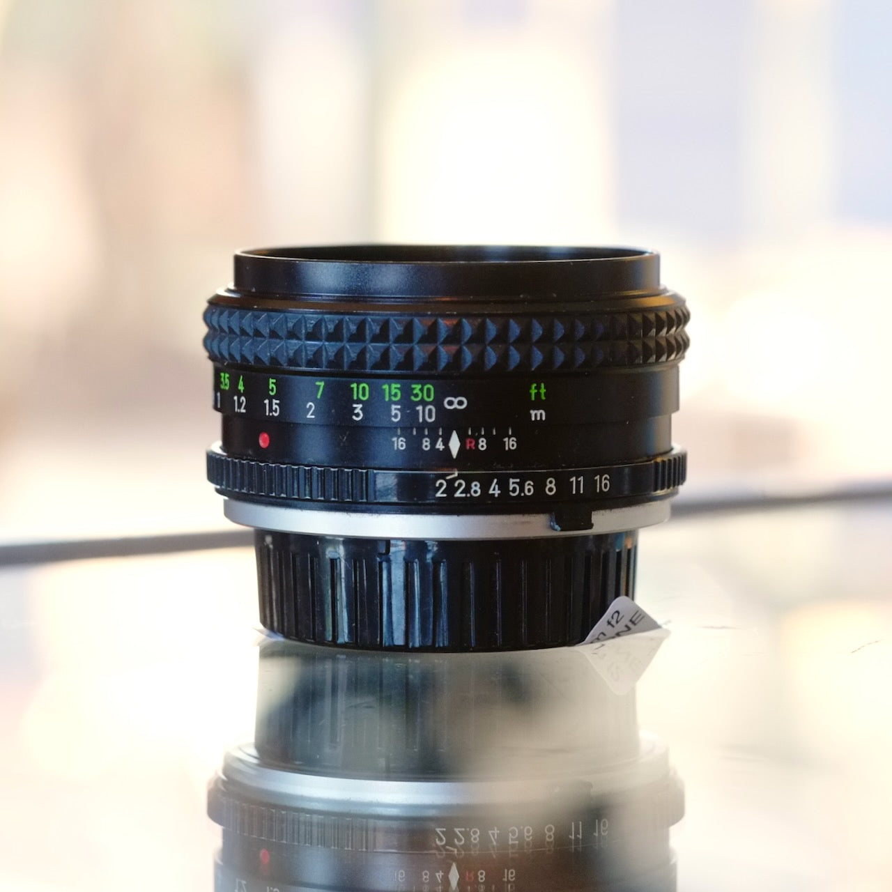 Minolta MC Rokkor-PF 50mm f2 for Minolta MD mount cameras. Clean glass, smooth focusing, good diaphragm. Dent in filter ring which interferes with filter mounting.