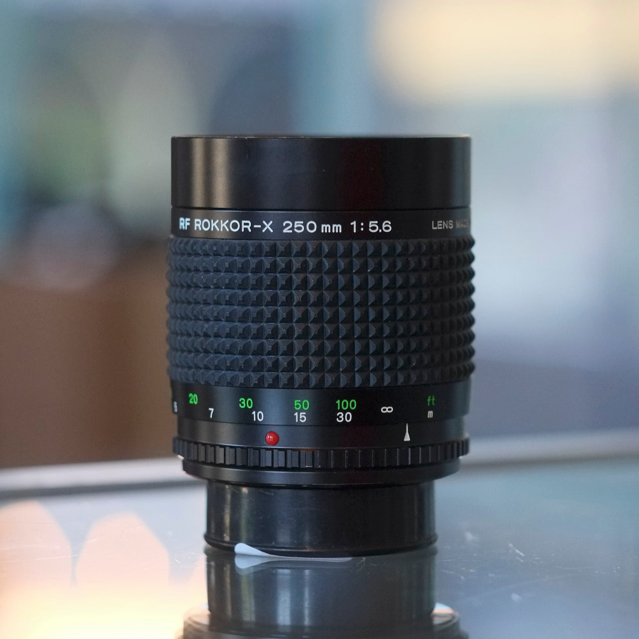 Minolta RF Rokkor-X 250mm f5.6 mirror lens for Minolta MD mount cameras. Small spot of material at edge of mirror, haze spot in the rear group. Neither should affect imaging. With front and rear caps, rear UV filter.