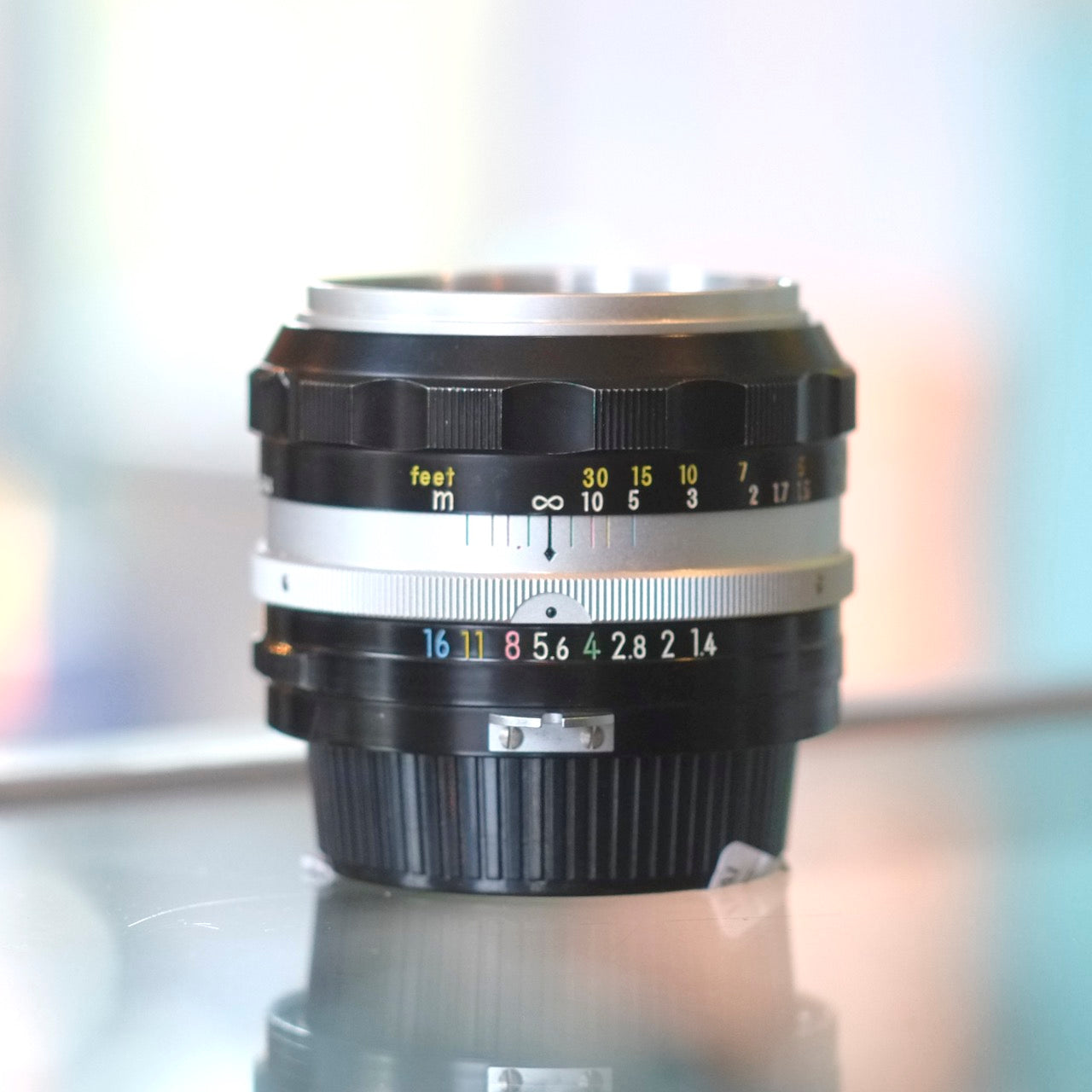This Nikon 50mm f1.4 Nikkor is in very good cosmetic condition. There is some fungus etching to the exterior of the rear element, glass is clean otherwise.