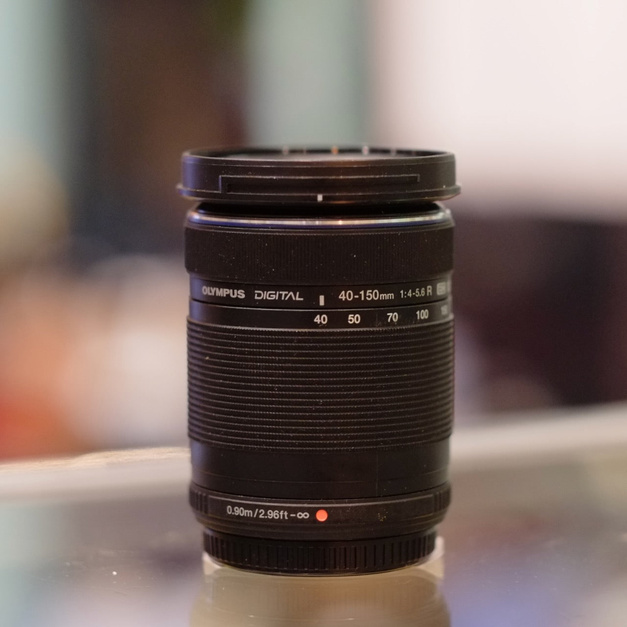 This Olympus M.Zuiko Digital 40-150mm f4-5.6R fits any Micro Four Thirds camera. Good function, some patterned haze in optics. With front and rear caps.