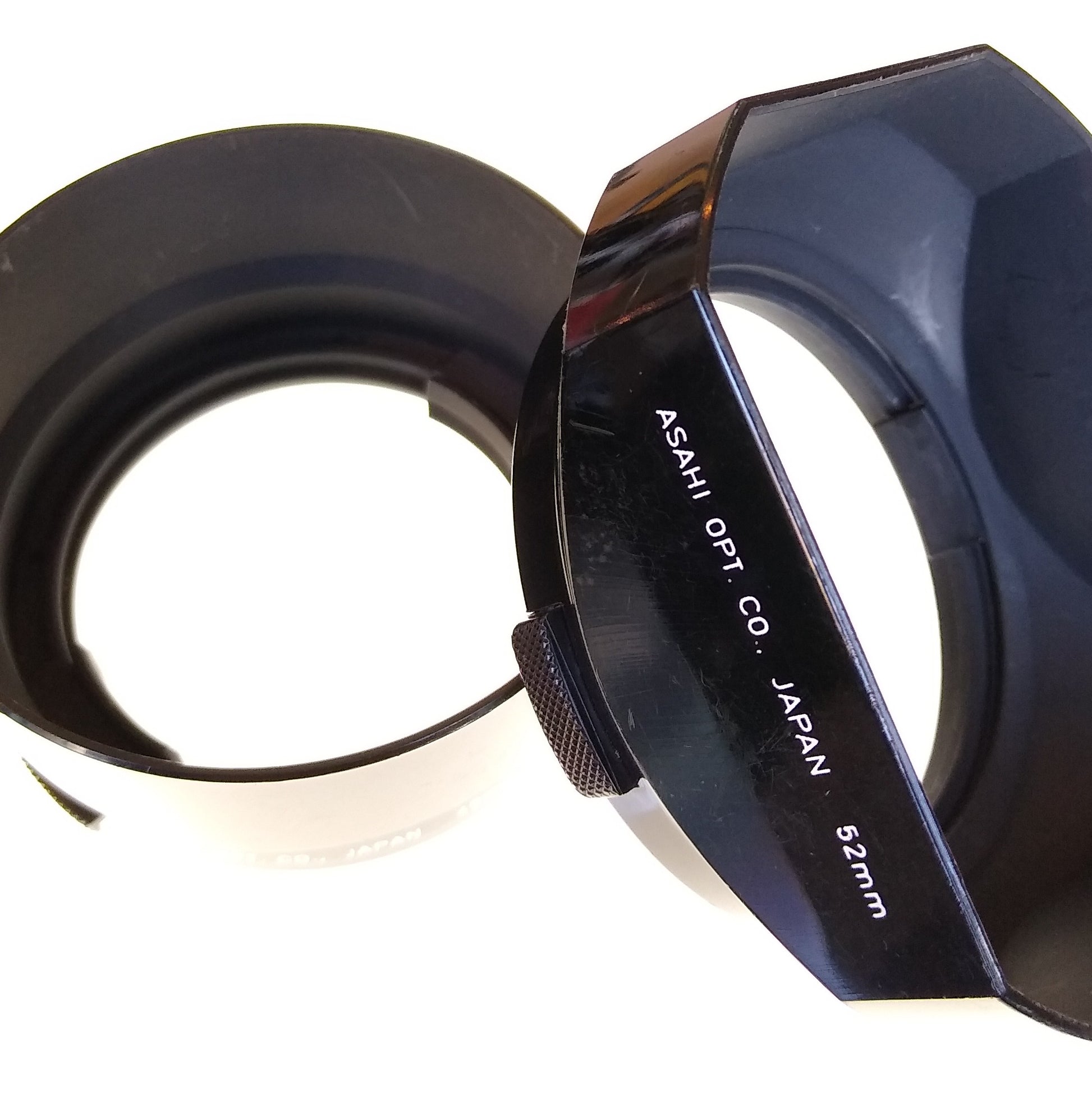 These are original Pentax clip-on plastic lens hoods. They are designed to fit only a specific lens or several, and will not mount or cover properly on other lenses. Please inquire with us if you have any questions regarding compatibility. All hoods are free from damage such as cracks or chipped mounts. They may have some minor cosmetic scuffing or wear.