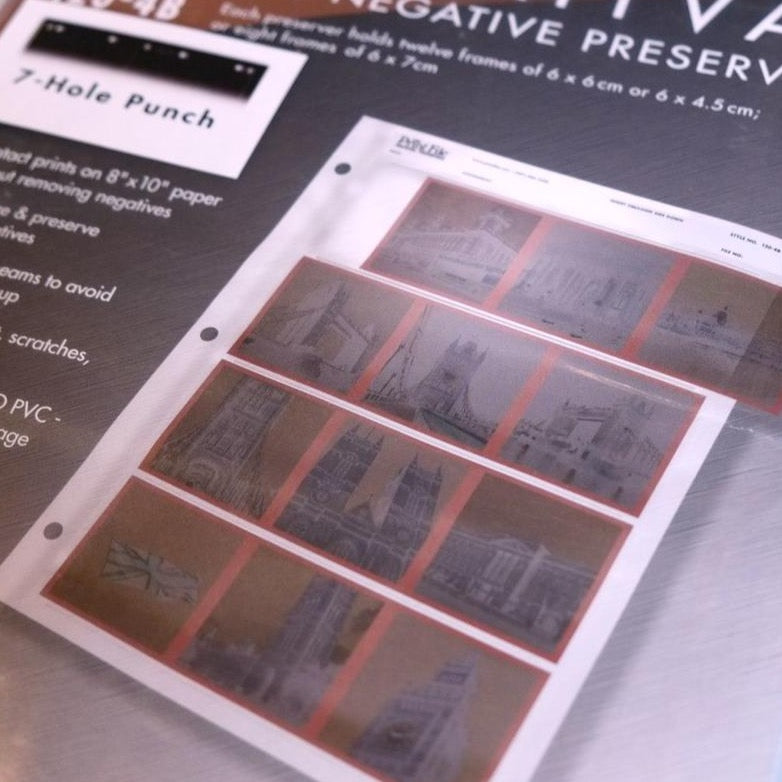 Printfile 120-4B archival negative sleeves for 120 film. Each sheet holds 12 frames of 6x6, 8 frames of 6x9, 16 frames 6x4.5.