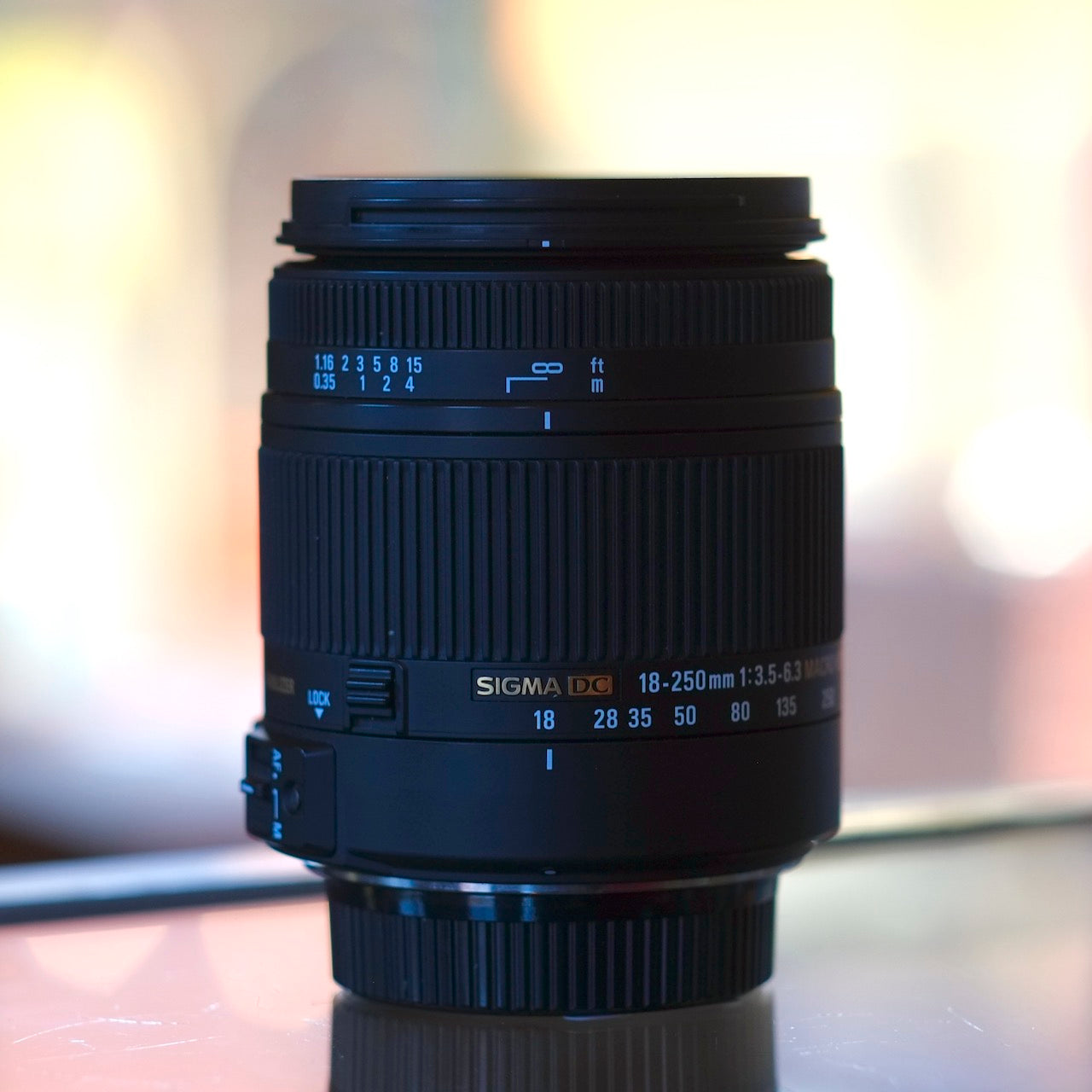 Sigma DC 18-250mm Macro HSM for Nikon F mount. Clean glass, good autofocus and zoom action. Manual action of the focusing ring has a sticky point at about the 1m mark. This lens is suitable for DX-format Nikon DSLR bodies.