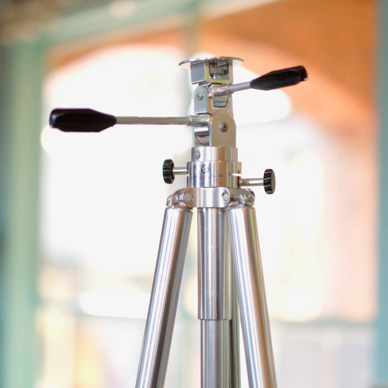 The classic Star-D Professional tripod, in all its gleaming aluminum glory. A distinctive, high quality tripod that may not be quite as lightweight as your modern alternatives, but looks and works well enough to make up for it. In excellent condition, with light finish wear.