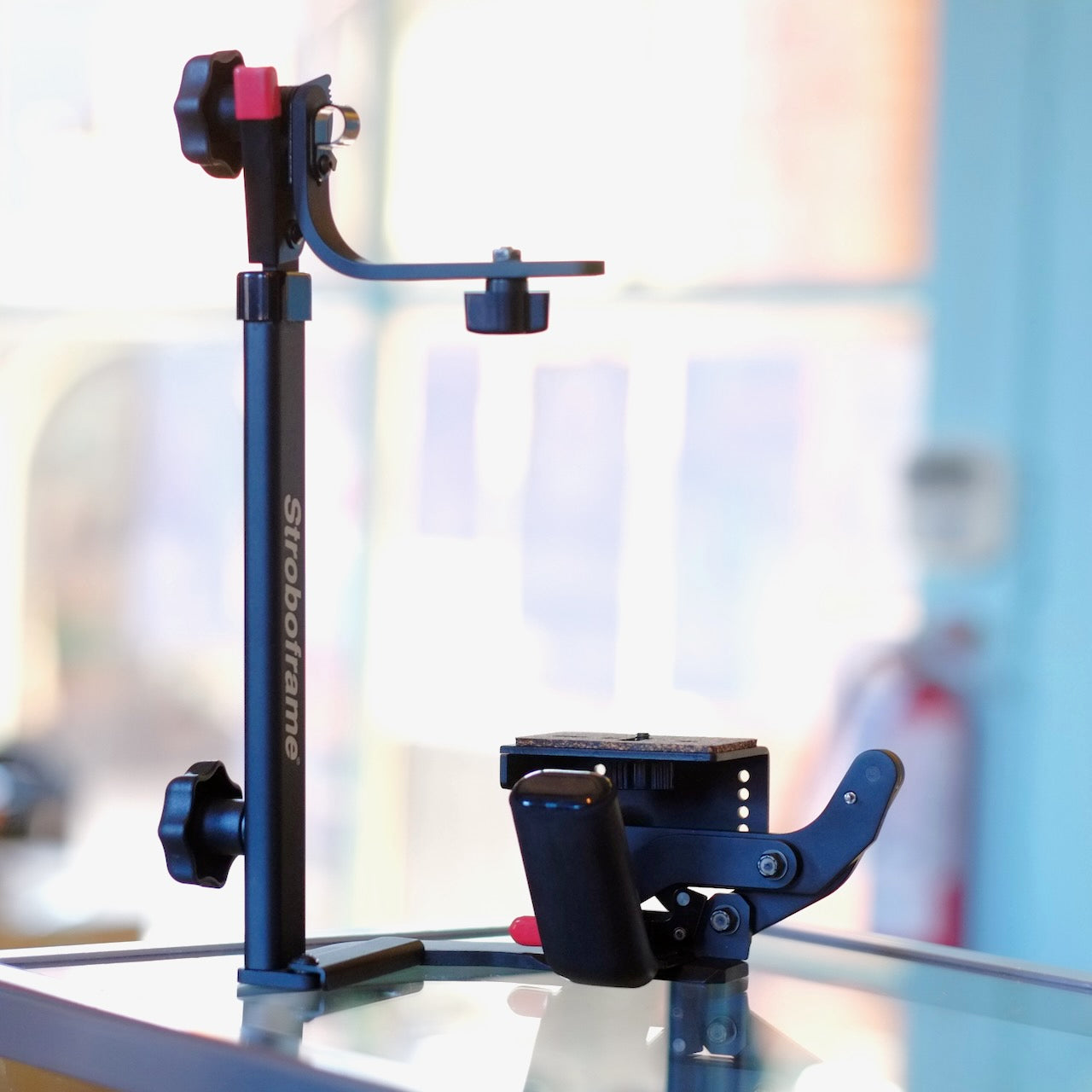 This Stroboframe Pro-RL Bracket is a large camera/flash bracket with a 90-degree rotating camera mount that permits easy switching between vertical and horizontal shooting, and an extendable flash arm that can extend from 18 to almost 40cm above the camera platform. It's big, but if you're a big flash shooter, this is a pretty versatile setup. In excellent condition.