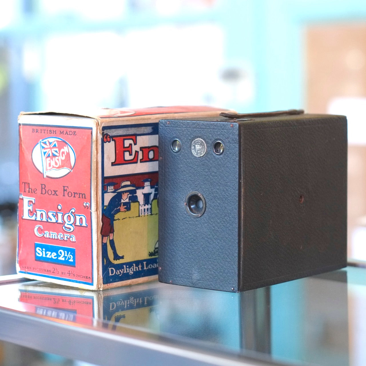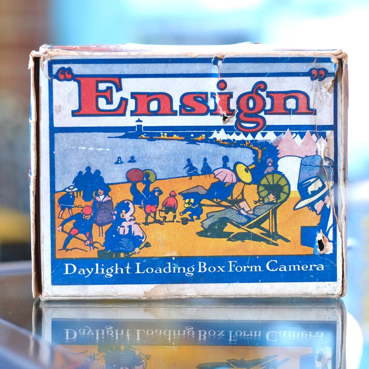 This Houghton Box Form "Ensign" is a classic box camera in beautiful original packaging, with different art front and back. The camera is in good shape overall, with minor corrosion on metal parts; the box has some wear, but folks, this thing is from the year nineteen hundred and twelve. That's the year the Titanic sank. It was 110 years ago, and this is a paper box.