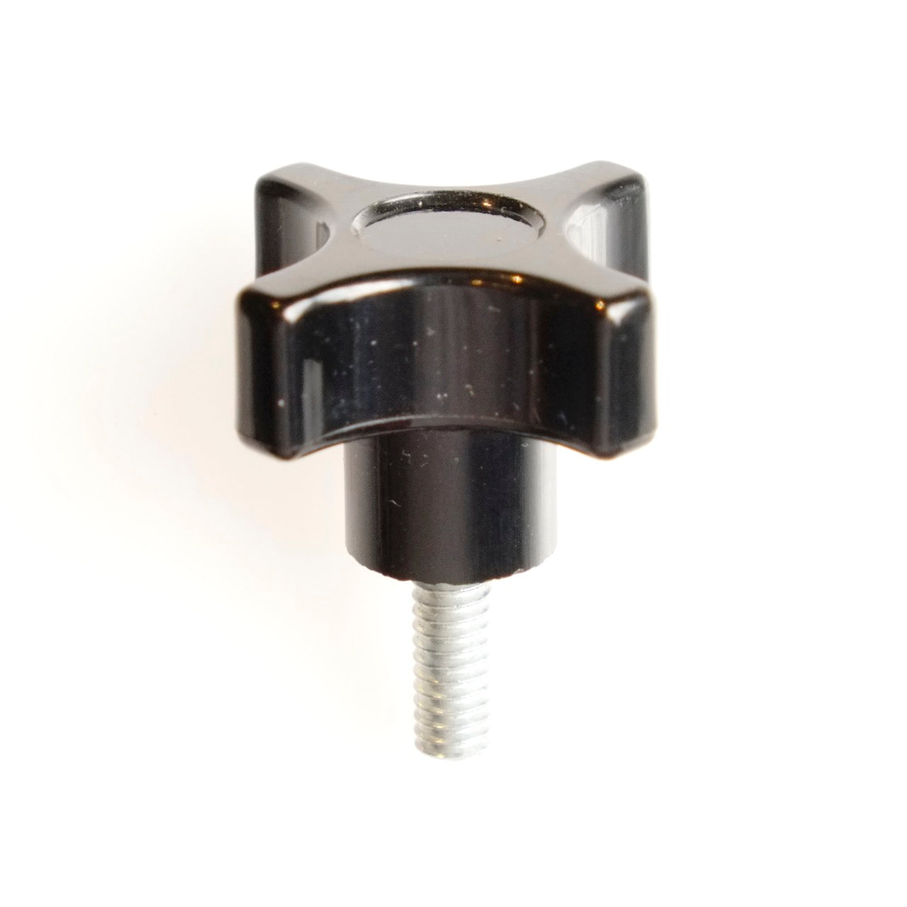 This thumbscrew has a good quality plastic four-lobe grip, plastic collar and a 1/4" external thread.