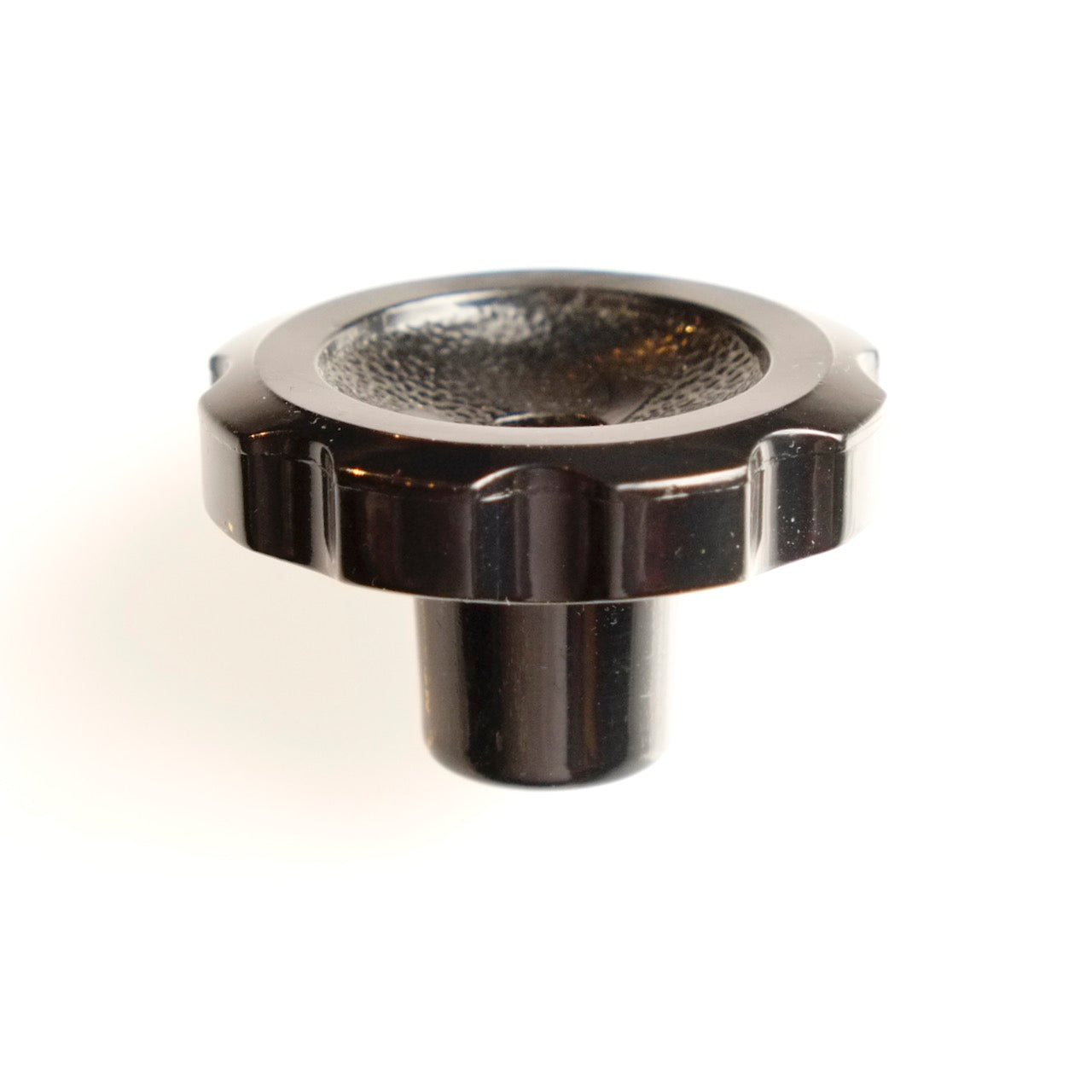 This thumbscrew has a round plastic grip with scalloped edges, a plastic collar, and a 3/8" internal thread.