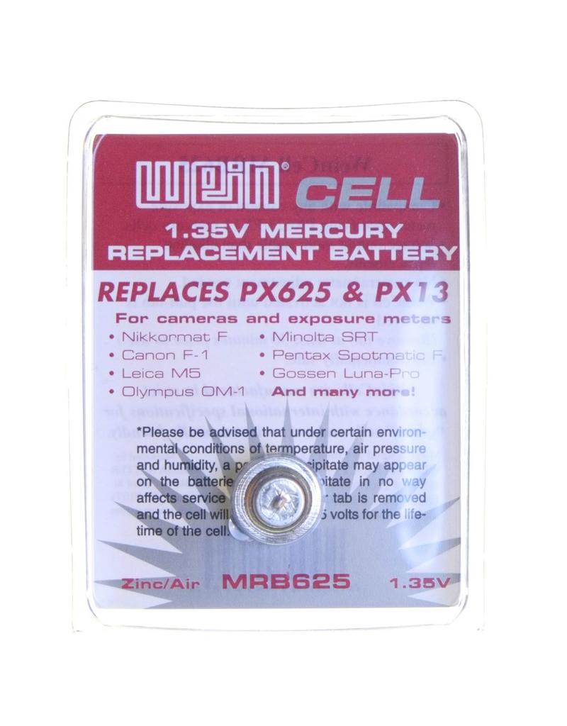 The Wein MRB625 is a 1.3v Zinc-air cell designed to replace the PX625 Mercury batteries in many older cameras, including the Olympus OM-1, Canon F1, and others.