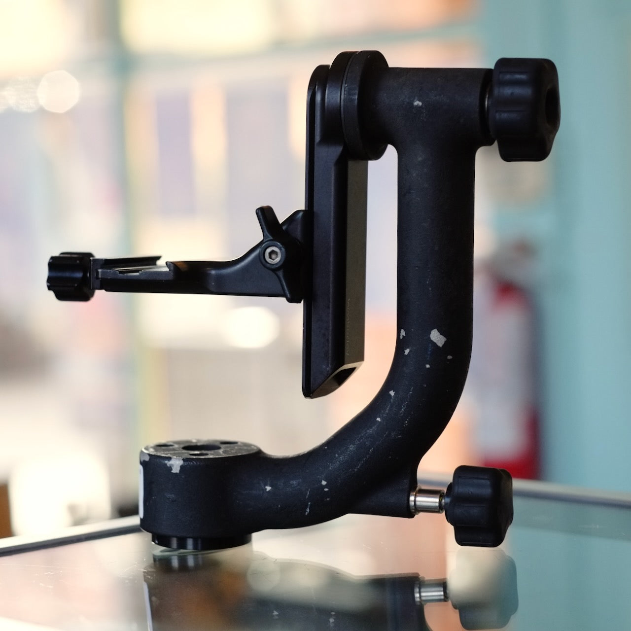 The Wimberley WH-200 Version II is a solid, professional gimbal head designed for long telephoto lenses: it'll hold up to 45kg, which should be enough for almost anything. Cosmetic condition is poor, with notable paint and finish wear. Movements are good, locks are tight. The integral clamp is Arca-compatible; camera plate is not included.