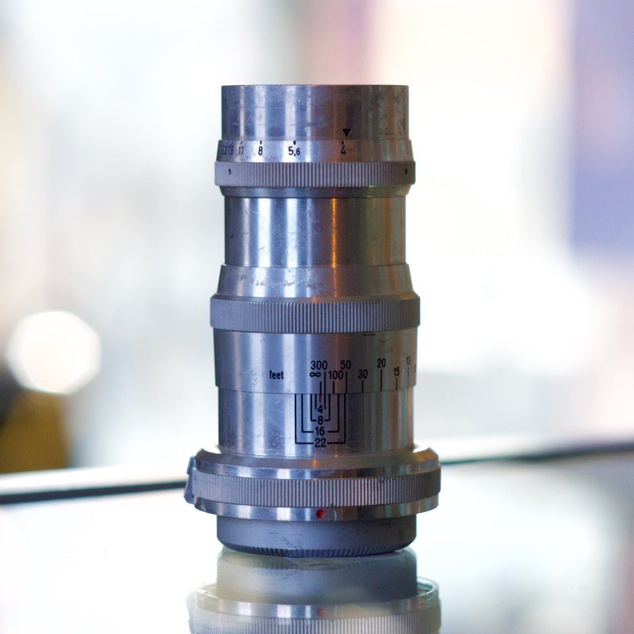 Zeiss-Opton Sonnar 135mm f4 lens for Contax rangefinder cameras. Heavy cosmetic wear on barrel, stiff focusing. Glass is free of major issues, with light internal marking. Clean diaphragm.